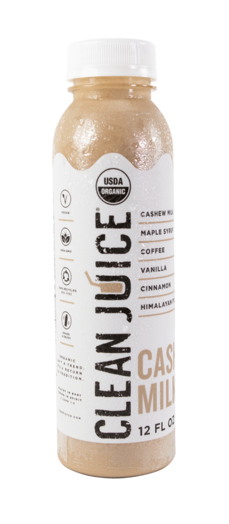 We have 4 sweet and filling cashew milks: White, Gold, Cashew Milk Latte & Cacao Milk. We have 1 savory juice for the hardcore veggie lovers: Green.